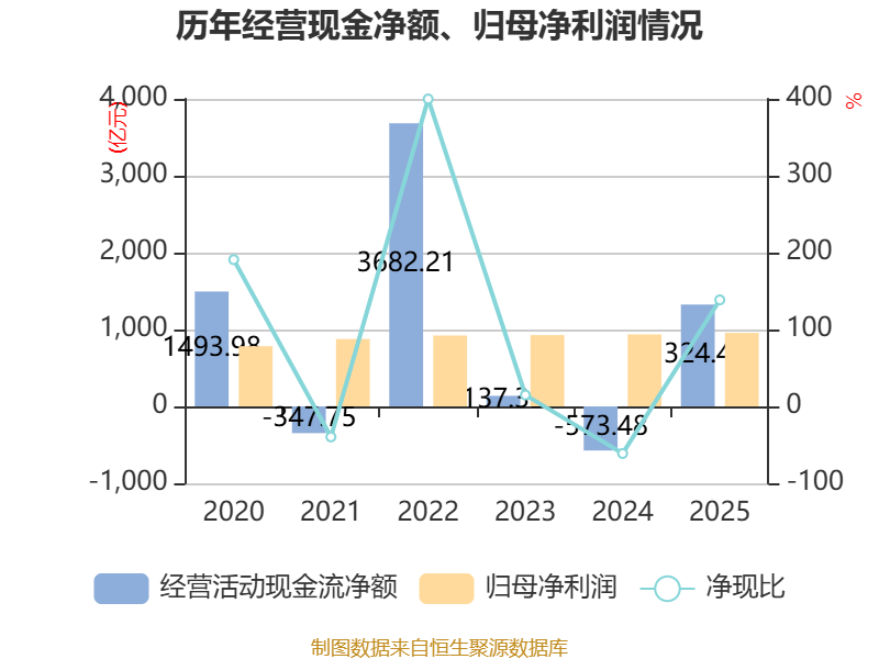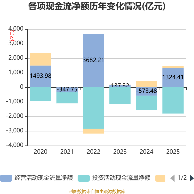 戒指2025年,公司野心看成现款流净额为1324.41亿元,同比增多1897.89亿元;筹资看成现款流净额129.52亿元,同比减少295.68亿元;投资看成现款流净额-1804.72亿元,上年同时为-980.89亿元。