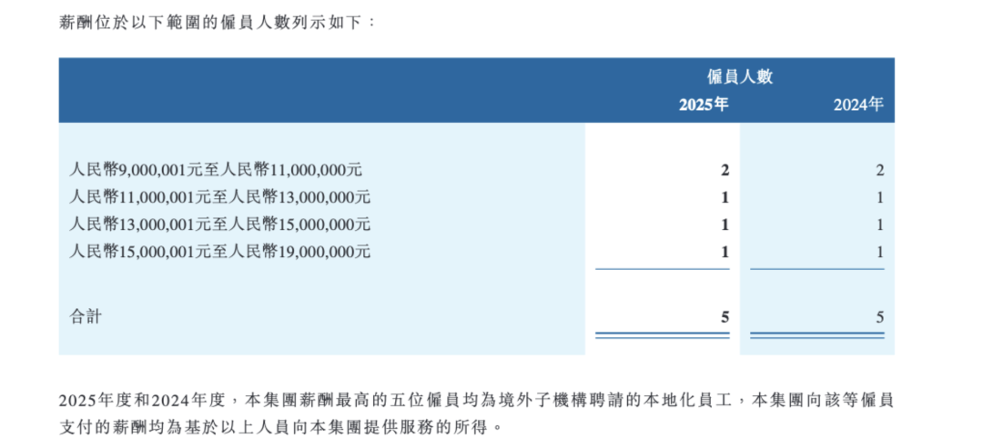 值得和蔼的是,千万级年薪的薪酬“天花板”再次出现。中信证券2025年港股年报袒露,客岁该集团薪酬最高的5名职工中,1东说念主的薪酬在1501万~1900万元之间,其余4东说念主的薪酬在901万~1501万元之间。但中信证券并未表示该职工的具体岗亭,仅暗示这5东说念主均为境外子机构聘任的腹地化职工,其向这些职工支付的薪酬均为基于以上东说念主员向本集团提供做事的所得。