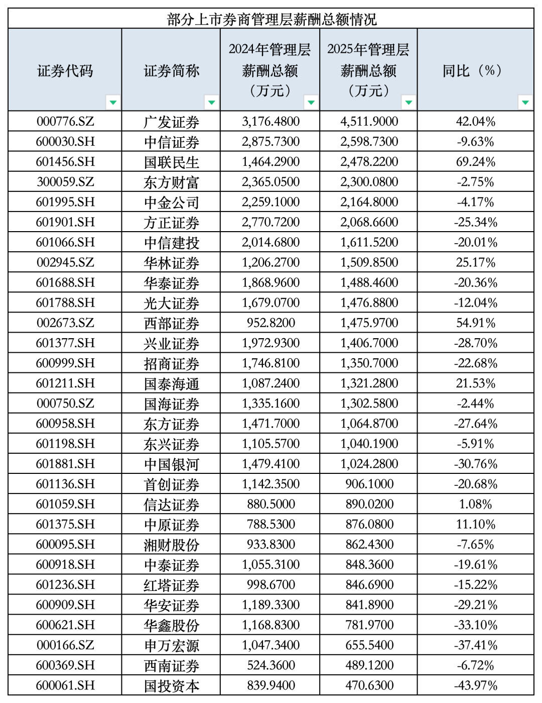 与此同期,国联民生证券、西部证券(002673.SZ)和广发证券(000776.SZ)等7家券商的经管层薪酬,在2025年出现“逆势”上升。比如国联民生证券,2025年该公司经管层薪酬总和2478.22万元,较2024年的1464.29万元大幅增长69.24%。